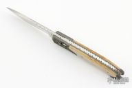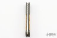 This Coil spring auto by Z Custom knives features a hand rub satin finished blade with fileworked spine. The action is fast and strong. Filework on stainless steel backspacer. Bead blast titanium frame is milled and has Oosic inlays on the frame and push button. This automatic from Chris English and the perfect size for every day carry. Excellent condition.