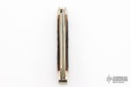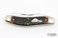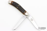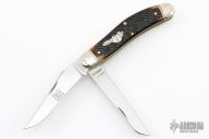 This Bayou Trapper by Northfield Knives features polished blades with nail nicks. The handle has nickel silver pinched and fluted bolsters, Chestnut Peach Seed Jigged Bone covers with a nickel silver beaver escutcheon, brass liners/pins. Has half stops. Comes with original tube. New condition.