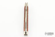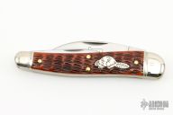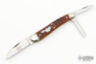 This English Whittler by Northfield Knives features satin finished blades with nail nicks. The handle has nickel silver fluted bolsters, Burnt Orange Jigged Bone covers with a nickel silver beaver escutcheon, brass liners/pins. Has half stops on the small blades. Comes with original tube. New condition.