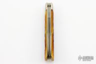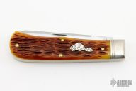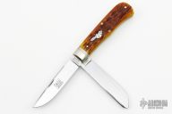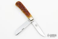 This Pioneer Trapper by Northfield Knives features polished blades with nail nicks. The handle has nickel silver pinched and fluted bolsters, Antique Autumn Jigged Bone covers with a nickel silver beaver escutcheon, brass liners/pins. Has half stops. Comes with original tube. New condition.