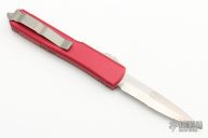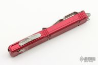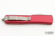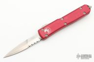 This Ultratech OTF automatic features a bayonet grind stonewash double edge blade with a partially serrated edge and a red anodized aluminum handle. Stainless steel clip. Glass breaker. Serial number 77399 and dated 03/2017. Comes with original box and papers. Excellent condition.