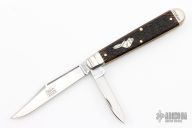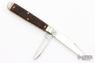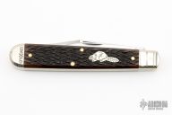 This English Jack by Northfield Knives features polished blades with nail nicks. The handle has nickel silver pinched and fluted bolsters, Autumn Gold Jigged Bone covers with a nickel silver beaver escutcheon, brass liners/pins. Has half stops. Comes with original tube. New condition.