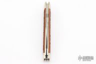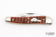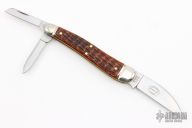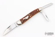 This English Whittler by Northfield Knives features satin finished blades with nail nicks. The handle has nickel silver fluted bolsters, Burnt Orange Jigged Bone covers with a nickel silver beaver escutcheon, brass liners/pins. Has half stops on the small blades. Comes with original tube. New condition.