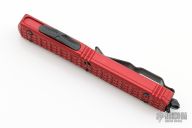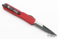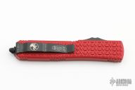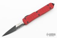 This Ultratech (#58579 09/2015) has a 2-tone black blade with satin flats finished and partially serrated double edge blade. Handle is red anodized aluminum with stainless steel tip up clip and glass breaker. Tri-Grip texture. Comes with original box and papers. Excellent condition.