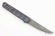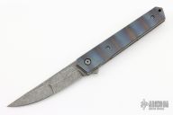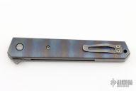 This Kwaiken flipper by Lucas Burnley features heat colored titanium scales, stonewashed titanium liners, backspacer, and tip up clip. The blade is multi-ground and acid tumbled with a flipper. Has the IKBS bearing system and is a very smooth and fast flipper that requires no wrist action. Excellent condition. Comes with a velcro case and COA.