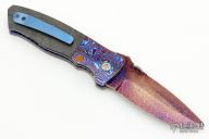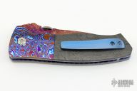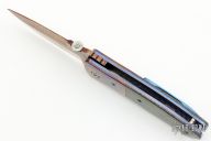 This Mod O Linerlock by KC Gray features a Nebula Damascus blade with knurled thumbdisc. The handle has dovetailed Timascus bolsters, space coral scales, orange peel and anodized titanium frame, and anodize satin finished clip. Nice detent, lockup and blade seating. Rides on bearings. Comes with zippered case and COA dated 11-21. Has a couple light scratches otherwise Excellent condition.