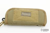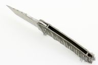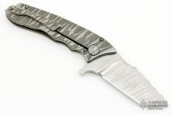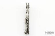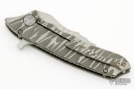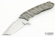 This Dub Impact flipper from Phantom Steelworks features a carved and satin finished tanto blade with swedge and flipper. The handle is comprised of a carved two-tone titanium frame with titanium barrel spacers. Carved titanium tip up clip. Nice detent, action, lockup and blade seating. Comes with a zippered case. Has a few light scratches, otherwise excellent condition.