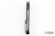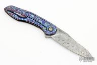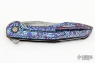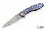 This Mini Tolk by Brad Southard features a Damasteel blade with notched thumbrest and flipper. The handle has a MokuTi frame with matching tip up clip and backspacer, lanyard pin, zirconium pivot collar. Has a stainless lockface insert with overtravel stop. Rices on bearings, nice detent, lockup and blade seating. Comes with original box and COA. Dated Dec 17 on box. Excellent condition. This knife is exquisite!