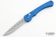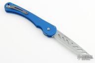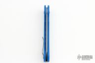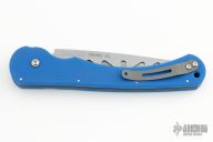 This Skunk Stripe Battlecat by Rob Dalton features a bead blast blade with slotted holes. Blue textured G-10 handle with a tip up bead blasted titanium clip. Black G-10 backspacer. Lanyard hole in pommel. Excellent condition. Prototype