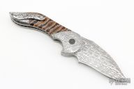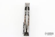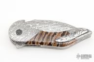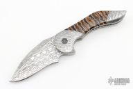 This Full Dress Føniks Linerlock Flipper by Glenn Are Hovin features a deep etch Damasteel blade with false top edge and flipper. The handle has deep etch Damasteel bolsters, front and rear, custom milled zirconium pivot, mammoth tooth scales, titanium liners with jeweled interiors, deep etch Damasteel backspacer, tip up zircuti pocket clip. This knife's only hardware visible is the pivot, every other screw on the knife is hidden, pretty impressive and clean. Nice detent, lockup and blade seating. Comes with zippered case. New condition. All the lines on this knife are super clean.