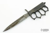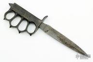 This Trench Knife by Joe Watson and Les George features a forced patina finished double edged blade with .195" blade stock, 1.006" blade depth, hidden tang construction. The handle has a distressed cast brass knuckle guard grip with a skull crusher. Comes with a zippered case. Excellent condition.