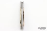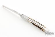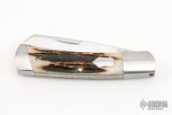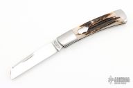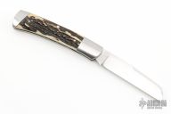 This Single Blade Sheepsfoot by Casey Berryhill features a hand rub satin finished blade with nail nick. The handle has satin finished stainless steel bolsters with integral liners, stag covers, stainless steel escutcheon and spring. Has half-stop, flush in all positions. New from maker. Comes with a zippered case and a COA.