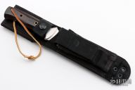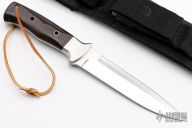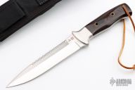 This SERE fixed blade from Al Mar Knives features a double edged blade and serrations on top, .149" stock and 1.155" depth, full tang construction. The handle has black/red paper micarta scales, brass tube pins over red liners, stainless steel bolsters.  Comes with black nylon sheath with stone. Excellent condition.