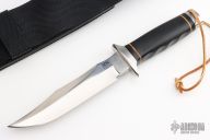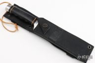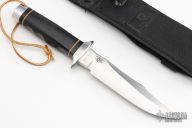 This Trident by SOG has a satin finished stainless steel clip point blade with false top edge, stainless guard and butt, and hidden tang. .276" blade stock, 1.199" depth. Handle has a stainless steel guard and butt with a stacked black paper micarta grip with white spacers. Comes with a original black nylon sheath. Has a couple light scratches, otherwise excellent condition.