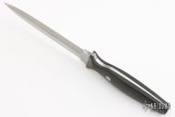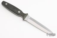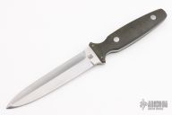 This Dagger by Bob Lum features a matte finished double edged blade with .185" blade stock and 1.017" blade depth, full tapered tang construction. The handle has black linen micarta scales. Excellent condition.