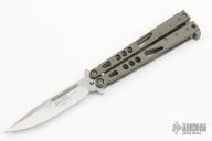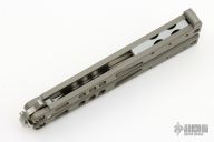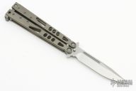 This Tachyon balisong by Microtech has a tumbled blade and skeletonized bead blast titanium handles. #0202 and dated 12/2001. Comes with original box, papers, and nylon belt sheath. Has a couple light scratches, otherwise excellent condition.