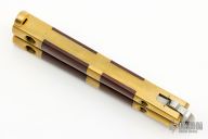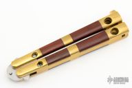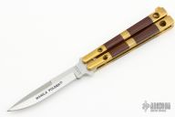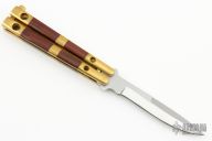 This Manilla Folder Balisong from Taylor/Seto features a satin finished spear point blade with a false top edge. The handle has an integral brass construction with rosewood inlays. Batangus style T latch on pommel. Has a couple light scratches, otherwise excellent condition. Comes with a zippered case.