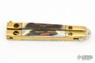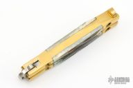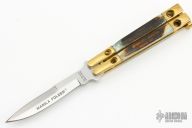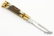 This Manilla Folder Balisong from Taylor/Seto features a satin finished spear point blade with a sharpened top edge. The handle has an integral brass construction with stag jigged bone inlays. T latch on pommel. Has some scratches, otherwise excellent condition. Comes with original box and a zippered case.