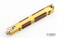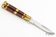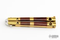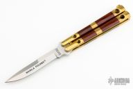 This Manilla Folder Balisong from Taylor/Seto features a satin finished spear point blade with a false top edge. The handle has an integral brass construction with rosewood inlays. Batangus style T latch on pommel. Has a couple light scratches, otherwise excellent condition. Comes with a zippered case.