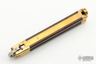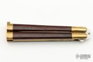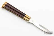 This Manilla Folder Balisong from Taylor/Seto features a satin finished spear point blade with a sharpened top edge. The handle has an integral brass construction with rosewood inlays. T latch on pommel. Has a couple light scratches, otherwise good condition. Comes with a zippered case.