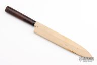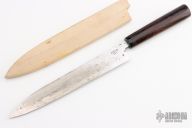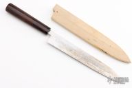 This sushi knife features an extremely sharp Tamahagane blade that is ground on both sides and a rosewood handle. The blade has been differentially heat treated by hand for a hard cutting edge and softer spine, and has a visible hamon. The blade is epoxied to the ferrule very cleanly, and the overall finish work is excellent. Great feel in the hand. Includes a wood sheath that fits snugly over the blade. Includes a padded zippered case.  Oxidation is visible on the blade.  There are a couple of light dings on the blade edge.  This knife could be cleaned up very nicely and would make a great addition to anyone's line-up.
