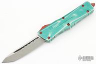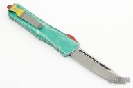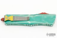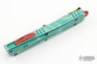 This Combat Troodon by Microtech features an Apocalyptic finished tanto blade. The handle has a distressed green aluminum frame with red hardware and a tip down stainless steel clip. Comes with original box and papers. Dated 05/2021 and s/n 1773. Excellent condition.