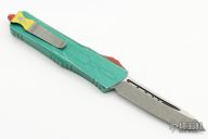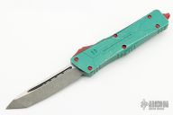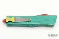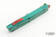 This Combat Troodon Bounty Hunter by Microtech Knives features a tanto blade with fullers, satin flats and apocalyptic finished grinds. The handle has a green battle worn aluminum handle with red hardware, tip down apocalyptic finished stainless steel clip. Dated 10/2022, s/n 2641.  Excellent condition.