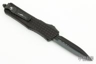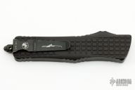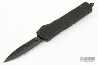 This Combat Troodon OTF automatic by Microtech knives features a double edged, DLC finished blade. The handle has a DLC frag pattern aluminum handle with black hardware, tip down carry. Glass breaker. Comes with original box and papers. Has a couple scratches on the clip, some wear on the eject switch, and a ding on the frame. Great condition otherwise.