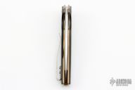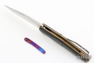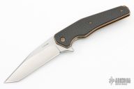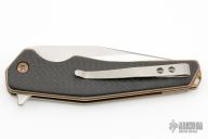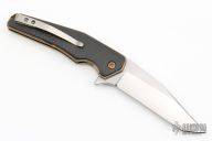 This Model 9 liner lock flipper features a satin finished recurve blade with flipper. The handle has carbon fiber scales, titanium liners and titanium backspacer.  Nice blade seating, detent and lockup. Orange peel finished tip up titanium pocket clip. Includes the original box and papers.  Excellent Condition.