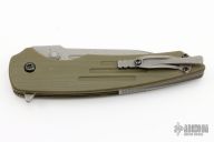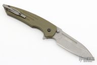 - Smooth G10 or carbon fiber slabs on the handle are crafted with a flared boat tail and the stonewashed blade with blackened hardware and two-piece titanium pocket clip complete the knife’s almost mystical aesthetic.