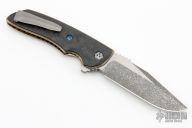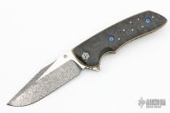 This knife from Allen Elishewitz features a black snow finished blade with notched thumbrest and flipper. The handle has marbled carbon fiber scales, anodized titanium liners and a bead blasted titanium tip up pocket clip with hidden screws. Nice detent, lockup and blade seating. Includes a velcro case. Excellent condition.