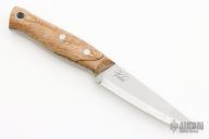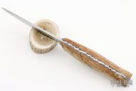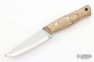 This Bushcrafter by Virtus Knives features a satin finished scandi ground blade, .121" blade stock and 1.095" blade depth, full tang construction. The handle has spalted wood scales, fileworked tang. Has some scratches, has been used, otherwise good condition.