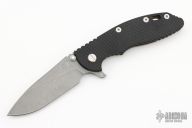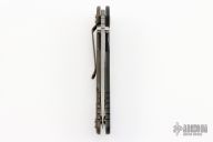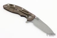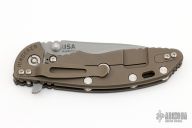 This Skinny XM-18 3.5" flipper by Rick Hinderer features a working finished blade with notched thumbrest and flipper. The handle has a battle bronze titanium frame with a black G-10 scale, a tip up or down reversible titanium clip and filler tab, lanyard hole at the butt. New condition. Comes with original box and extra hardware.