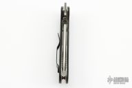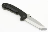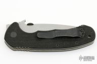 This Barracuda by Emerson Knives features a stonewashed tanto blade with swedge, knurled thumb disc, wave feature. The handle is comprised of black G10 scales over titanium liners and black standoffs. Black coated tip up clip and lanyard hole in pommel. #0083. Has some scuffs on the handle, otherwise excellent condition. Signed by Ernie Emerson 1 of 104