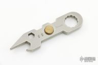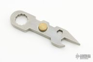 The Atwood SpinWrench mini pocket tool in CPM 154 steel will serve you well and entertain you. Features include 1/4", 5/16", and 1/2" wrenches, stout extra leverage pry tip/screwdriver and cap lifter. The center opening is sized to accept a 3/8" press fit spin bearing if desired. Great fun and functional in a small package. Comes with bag and card. Excellent condition. Comes with bearing installed.