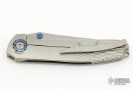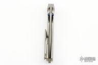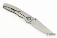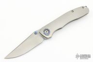 This D.U.K. by Kody Eutsler features a matte finished blade with dual anodized titanium thumbstuds. The handle has a milled and blasted titanium frame with black timascus pivot collars, tumbled titanium backspacer and tip up clip with hidden screws. Rides on bearings, nice detent, lockup and blade seating. Comes with a zippered case and COA. Excellent condition.