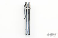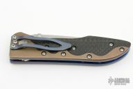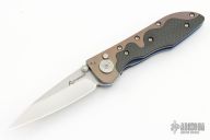 This Phantom auto by Allen Elishewitz features a tumble finished blade with dual thumbstuds. Scales are anodized titanium and carbon fiber with titanium hardware. Has anodized titanium liners and purple standoffs. Clip is anodized titanium, tip down carry. This knife is numbered 49. Nice function and lockup. Includes a padded zippered case.  Excellent Condition.