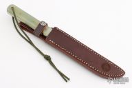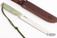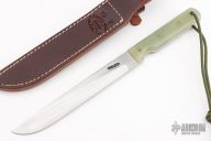 The Model 10 by Randall Made Knives is an ideal knife for yachtsmen and fisherman as well as for general household uses. This knife has a 5" stainless steel blade with notched thumbrest, has NASA etched on the back of the blade, .135" blade stock and .871" blade depth, full tang construction. The handle has lime green G-10 scales with brass pins and lanyard tube. Comes with a brown leather sheath with NASA Meatball logo. Excellent condition. The G-10 on this knife was from the NASA space program, it was an insulator. 1 of 20