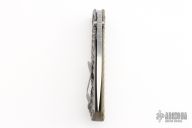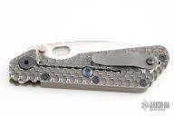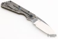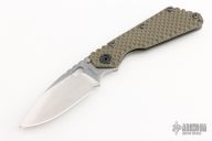 This SNG GG by Strider has a stonewashed drop point blade with dual thumb studs, thumb hole, and notched thumbrest. Handle is green G-10 and titanium "Gunner Grip", with lockbar stabilizer, and bead blasted titanium tip up clip. Has scuffs and scratches, has been resharpened and it is very well done, otherwise good user condition. Nice detent, lockup and blade seating.