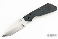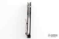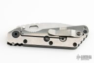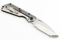 This SMF CC by Strider Knives features a satin finished tanto blade and smooth black G-10 and stonewashed titanium handle and matching tip up titanium clip. Notches on thumbrest, rear of handle, and early lockup. Includes Hinderer "Lock Bar Stabilizer" for maximum reverse lock retention. Has a couple light scratches, otherwise excellent condition.
