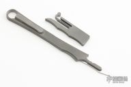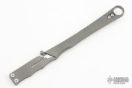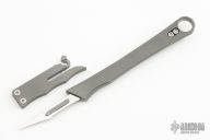 This pocket scalpel by Jackson Knife and Tool features a milled titanium body with tip up titanium clip. The sheath slides on over a #11 replacable blade. Has a couple light scuffs, otherwise excellent condition. Very cool design.