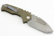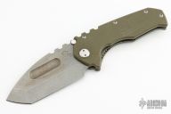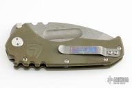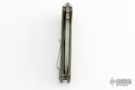 This Praetorian from Medford Knife and Tool features a tumbled blade made from D2 steel with fuller/thumb grooves and a notched thumb rest. The handle is comprised of green G-10 over a blasted titanium liner. Tumbled finished titanium tip up pocket clip. Has scuffs, scratches, oxidation, has been used, otherwise good user condition. Nice detent, lockup and blade seating.