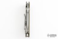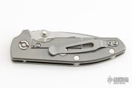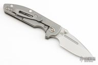 This TAD Dauntless Compact Hinderer features a spear point blade with fullers, notched thumbrest, and dual thumbstuds. The handle has a green G-10 front scale with 3 milled fullers, matte finished titanium frame with matching tip up clip. This knife features the Tri-Way pivot system. Has some scuffs and scratches, otherwise good condition.