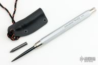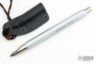 This spike pen features a black oxide finished spike that is deployed by pressing the button at the rear of the pen. This pen has been internally modified to accept and eject the spike with the push of the rear button. A piece of pencil graphite is positioned at the tip to conceal the spike. Works as a functioning pencil. New from maker. Very clever. Comes with a kydex neck sheath.