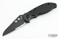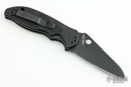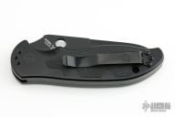 This C121PBK Embassy from Spyderco features a black sheepsfoot partially serrated blade with swedge, small thumbhole and notched thumb ramp. The handle has an aluminum frame with black G10 inlays. Lanyard hole in pommel. Reversible black coated stainless steel tip up clip. Blade is deployed via push button with fast coil spring action. Sliding safety on "A" side of handle. Excellent condition. Comes with a zippered case.