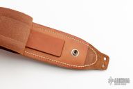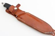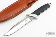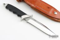 This fighter by Vaughn Neeley features a bead blasted blade with false top edge, .250" blade stock and 1.151" blade depth, hidden tang construction. The handle has a satin stainless steel guard and butt with a black linen micarta grip. Comes with a brown leather sheath with a sharpening stone in the back. Excellent condition. "031 SFBII  VN-0810" on back of blade.