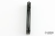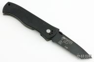 This Benchmade/Emerson Collab CQC7 970SBT features a drop point, tanto style, chisel ground, black coated blade with false top edge, thumb disc and notched thumb ramp. Black G10 scales over titanium liners and black backspacer. Has holes for a tip down pocket clip, has lanyard hole in pommel. Missing the clip, has some light scuffs, otherwise excellent condition.