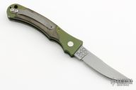 This Small Persian Fighter from Rob Dalton features a bead blasted blade and a green aluminum frame with black linen micarta inserts on both sides. Satin finished clip. Strong and fast coil spring opening. Has some scuffs on the clip, otherwise excellent condition.