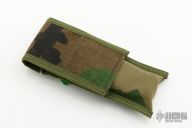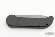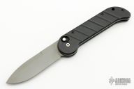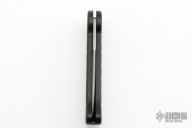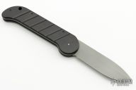 This Black Knife by Charles Ochs features a bead blasted drop point blade with swedge. The handle is comprised of black anodized machined aluminum. Lanyard hole in pommel. Comes with camo nylon sheath. Has a couple light scuffs, has some blade play, otherwise good condition.