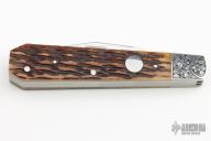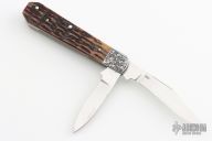 This Slipjoint by Joe Knipstein features hand rub satin finished blades with nail nicks. The handle has engraved stainless steel bolsters with integral liners, stainless steel springs, stainless steel escutcheon, jigged bone covers. #003 on blade. Has a couple of very light scratches, otherwise excellent condition. Engraving done by Bruce Shaw.